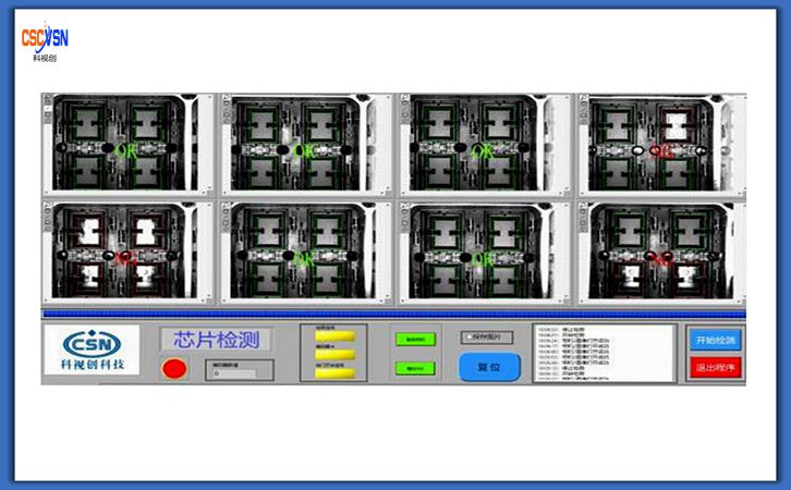 本系統(tǒng)主要用于芯片檢測。采用八個(gè)相機(jī)同時(shí)對料盤上八個(gè)位置的芯片進(jìn)行檢測。由于機(jī)臺(tái)持續(xù)運(yùn)動(dòng), 不會(huì)停止,所以采用飛拍模式,主要的功能為檢測芯片是否放置到位,是否有放偏、漏放、缺損、卡料錯(cuò) 位的現(xiàn)象,一次性完成 32 工位的芯片的檢測