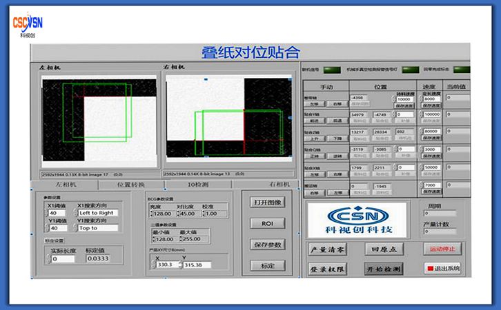 本系統(tǒng)主要用于疊紙對位貼合。采用雙相機分別對來料的底料疊紙對角進行拍照,得到貼紙的對角點的坐 標,根據(jù)兩個相機中心及疊紙實際大小,得到疊紙實際坐標,從而引導進行貼合。